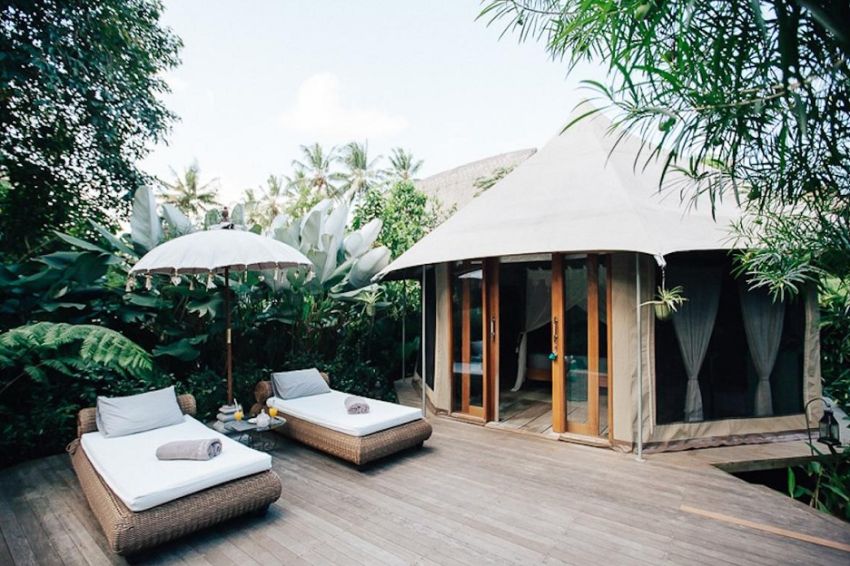 Terletak di hamparan sawah Bali yang sangat hijau, beberapa tenda safari ini terlihat mewah, juga otentik dengan pemandangan lokal. Pengunjung akan dimanjakan saat melakukan latihan yoga dan meditasi.