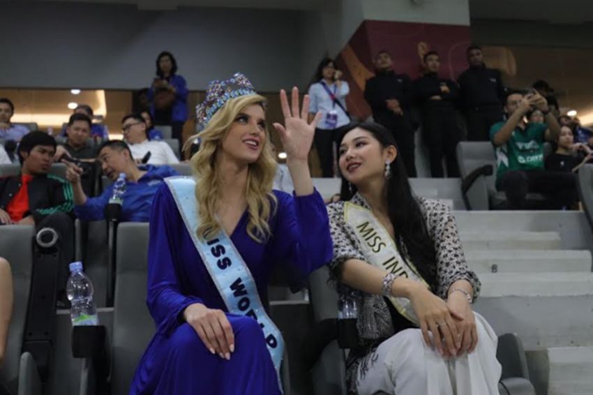 Miss Indonesia 2022 Audrey Vanessa dan Miss Wolrd 2024 Krystyna Pyszkova turut menghadiri perhelatan ‘RCTI Premium Sports’ yang digelar di Jakarta Internasional Stadium (JIS), Jakarta Utara, pada Kamis (30/5/2024). Foto/MPI/Aldhi Chandra
