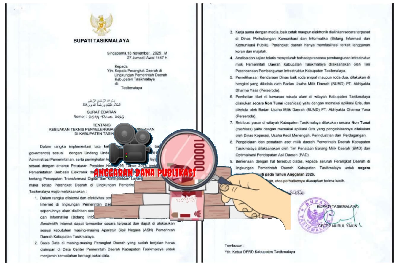 Beritanasional.id – Tasikmalaya, Jawa Barat,- Surat Edaran Bupati Tasikmalaya Nomor 0044 Tahun 2025 tentang Kebijakan Teknis Penyelenggaraan Pemerintahan yang diterbitkan pada 18 November 2025 seharusnya menjadi pedoman baru bagi seluruh perangkat daerah. Salah satu poin krusial dalam edaran tersebut, yakni poin ketiga, menegaskan bahwa kerja sama publikasi dengan media cetak maupun elektronik dialihkan secara terpusat ke Dinas Perhubungan, Komunikasi, dan Informatika (Dishubkominfo), khususnya Bidang Informasi dan Komunikasi Publik. Perangkat daerah hanya diperbolehkan mengalokasikan anggaran untuk berlangganan koran dan majalah.