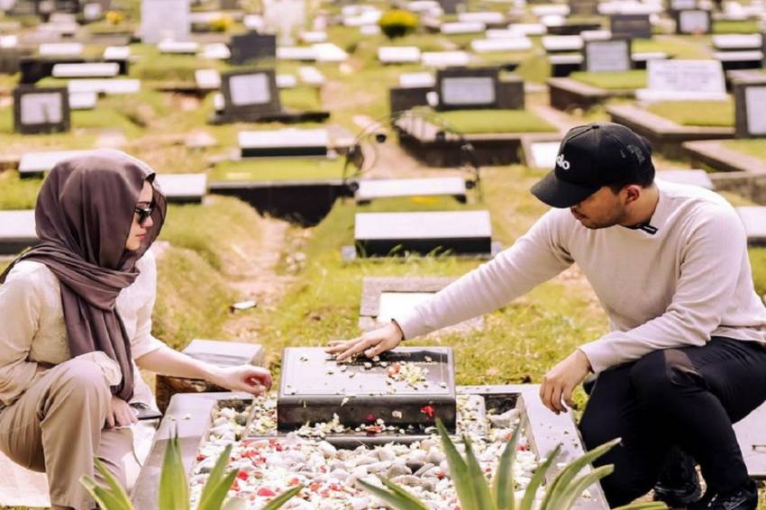 Thariq Halilintar datang ke makam mendiang ayah Aaliyah, Adjie Massaid. Dia meminta izin menikahi sang putri. Foto/ Instagram