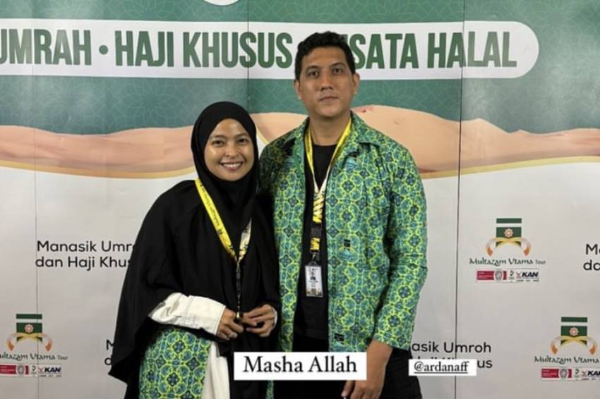 Pada unggahan lainnya, pemilik nama asli Tantri Syalindri Ichlasari ini juga membagikan foto bersama suaminya. Keduanya memakai seragam haji warna hijau.