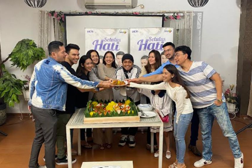 Para pemain dan kru melakukan potong tumpeng sebagai ucapan syukur serta harapan terbaik untuk sinetron Setulus Hati. Foto/MPI/Nurul Amanah