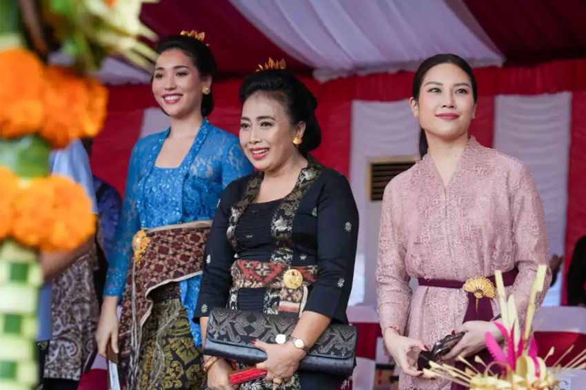 Wamenparekraf Angela Tanoesoedibjo dan Menteri PPPA I Gusti Ayu Bintang Darmawati (tengah) tampil dalam balutan busana tradisional Bali saat menghadiri pembukaan Pesta Kesenian Bali 2024 di Denpasar, Sabtu (15/6/2024). Foto/SINDOnews